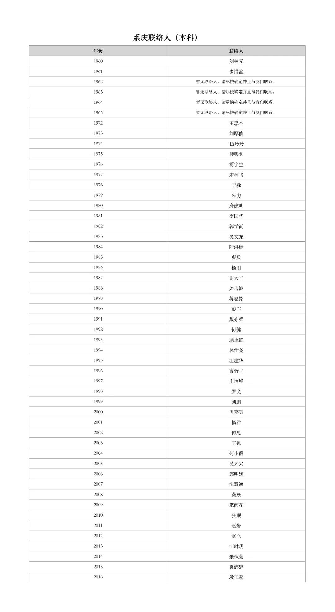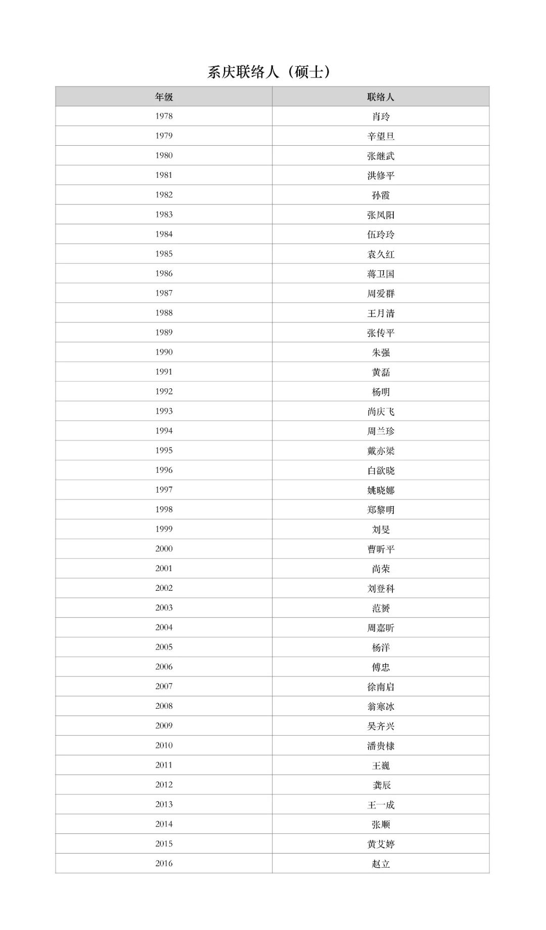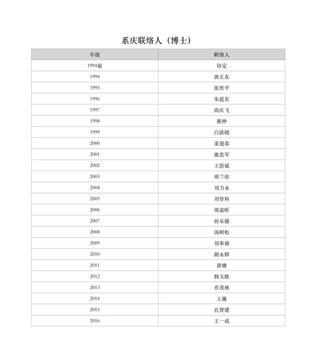 经前期与哲学系本硕博各级系友联络沟通,现确定以下系友为所在班级的系庆联络人。请暂无联络人以及未在名册中的班级尽快确定联络人,并与哲学系系庆联络人对接。各类专科班、省市干部班、军队干部班、地方定向培养班、劳模班、成教班、研究生进修班等班级有意愿参加系庆相关活动的系友,也请尽快与哲学系系庆联络人联系。